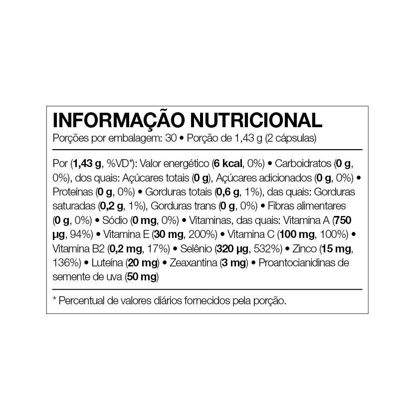 Fonte de Vitamina A, E, C, B2, selênio e zinco; Contém Luteína, Zeaxantina e Proantocianidinas de semente de uva; Proteção antioxidante.